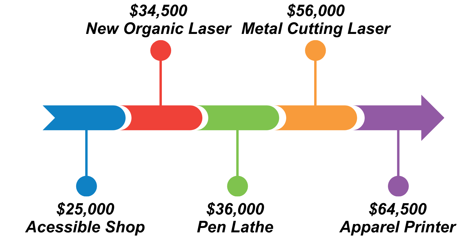 Beyond $25,000 helps fund new tools. At $64,500, all four new tools will be funded! Additional funding after that supports accessibility improvements in the shop, entrepreneurship and artist in residence programming, and much more!