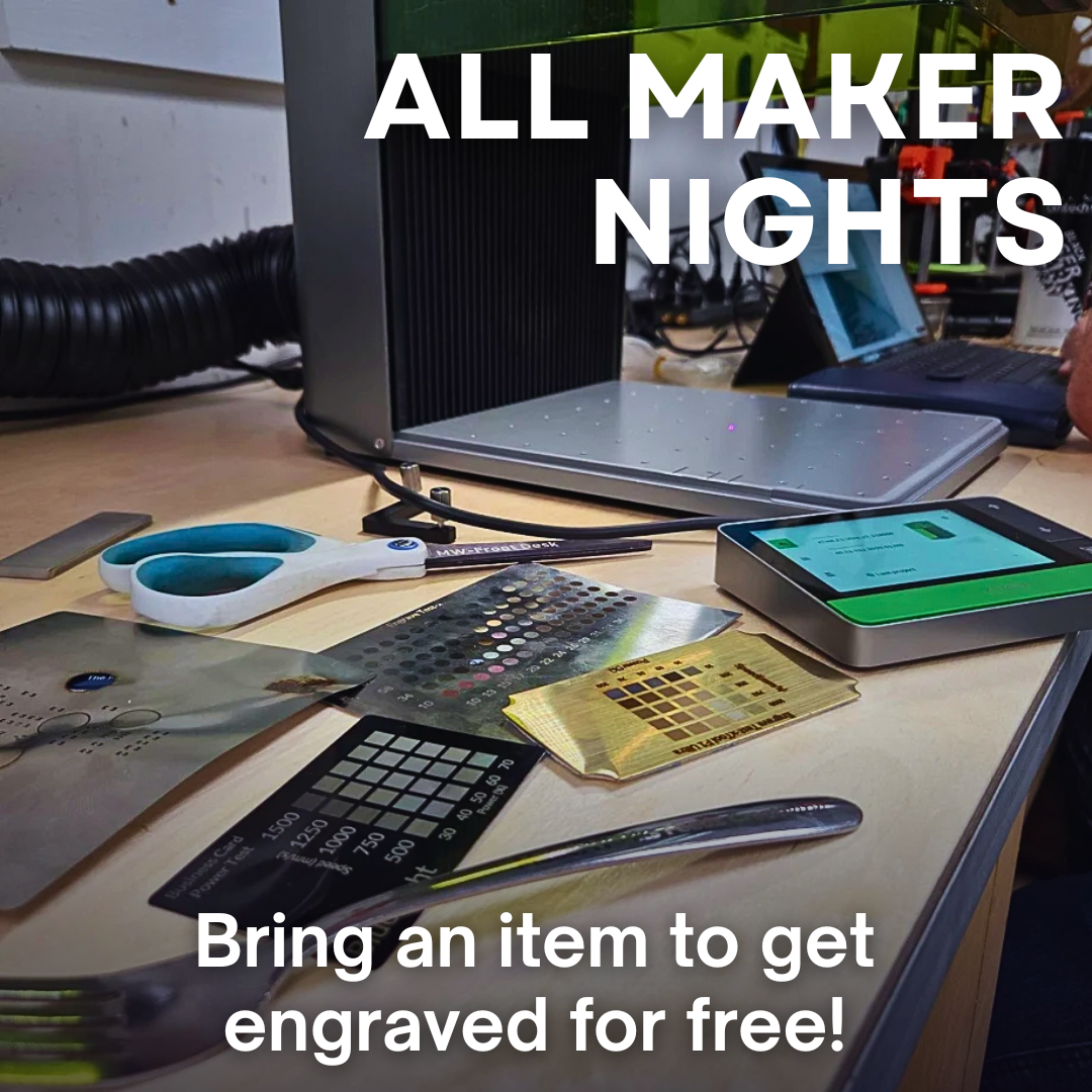 If you’re attending an Open Maker Night, you can bring an item to get engraved for free! We can engrave items that fit in an 8” x 8” x 5” box — keychains, dog tags, tools (wrenches, scissors, even drill bits!), chocolates/candies, or jewelry. If you bring a material that cannot be identified, we will not engrave it.